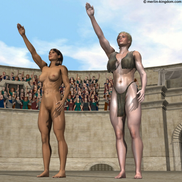 shot by the archers. They stood facing him. The Greek, in all of her naked magnificence, saluted and prepared for another fight. The Roman warrior itched to tangle with this upstart and wanted to teach her a lesson to remember. |