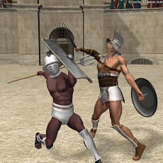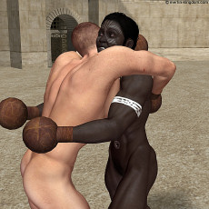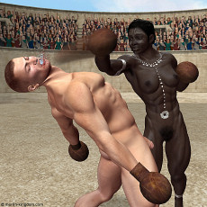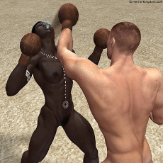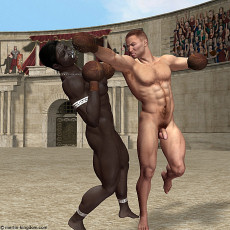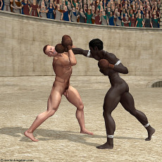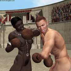 This story features a short fight between two male gladiators followed by a caestus fight between a powerful African woman and a Roman man. Here are a couple of sequences from the fights to give you a taste of the action:
