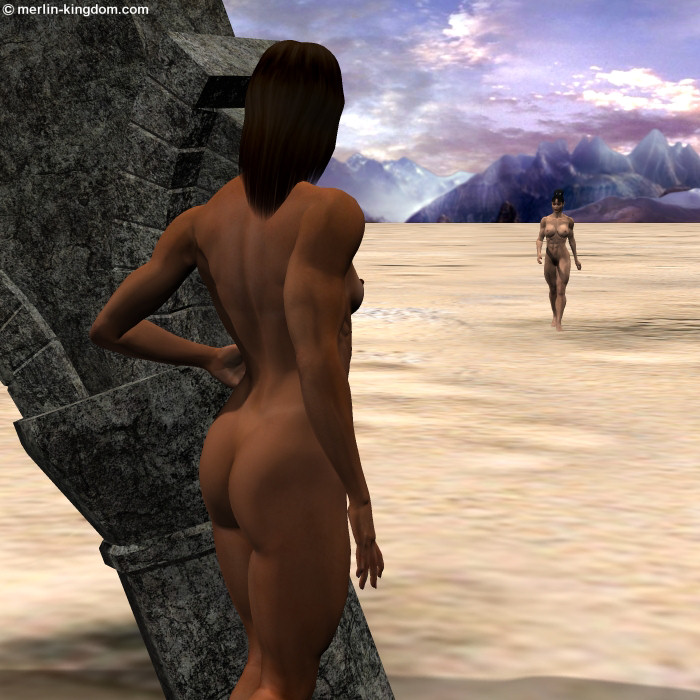 woman strolling across the sand towards the ruins. "Is this my punishment coming or another prisoner?" she wondered. |