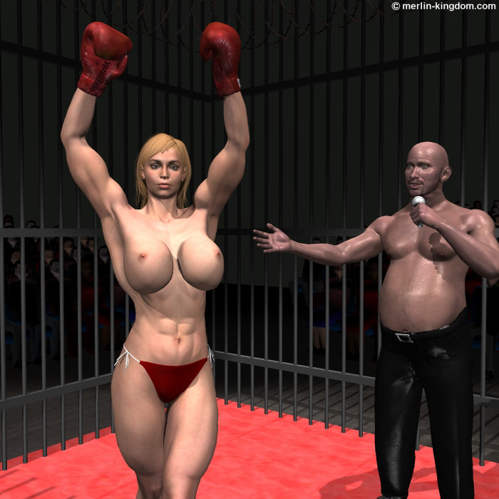 standing there stripping off her robe and belt. "Arial is from Canada and this her first fight as a professional. She is 5' 7" and weighed in this afternoon at 148 lb!" Arial raised her arms to the loud cheers from the huge crowd. |