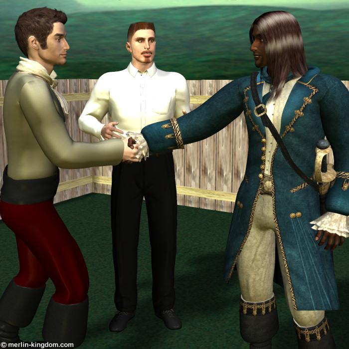 Captain meet in the stockade to agree the terms of the fight. "I am putting a 10 gold ducats down for the winner!" says the Captain. "I don't expect you to wager anything like that sum, but maybe you can put something down as a gesture of goodwill?" "Of course..." says Jake hesitantly. "Well... ummm.. maybe I will wager 10 guineas in gold!" "Agreed!" says the Captain snatching up Jake's hand and shaking it firmly. Sir Richard gulps in dismay - 10 guineas in gold is probably all the money that the Palmers have in the world! |