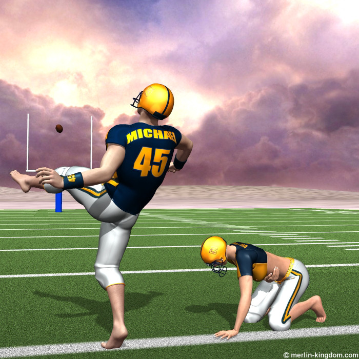 The Jock picks up the ball that Cindy has dropped and leisurely kicks it clean over the goal. "Wow what a great kick! 1 - 0 to me!" he yells as he watches the ball go bouncing off the end of the field into the desert sand beyond.